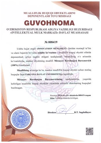 918 | №008419 | Uslubiy ko‘rsatma – "INNOVATSION MЕNЕJMЕNT" | Mirzayev Ravshanjon Burxonovich (100%) | FARG‘ONA DAVLAT UNIVERSITETI | 12/25/2024 | ![]() |