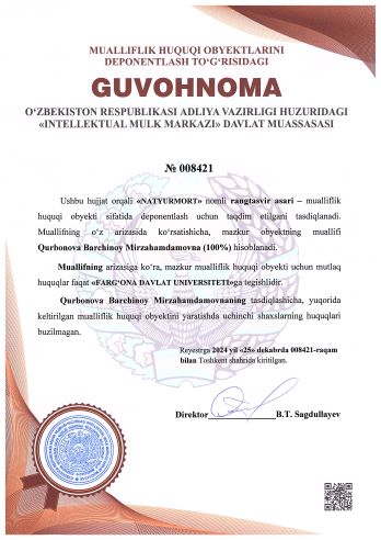 916 | №008421 | Rangtasvir asari – "NATYURMORT" | Qurbonova Barchinoy Mirzahamdamovna (100%) | FARG‘ONA DAVLAT UNIVERSITETI | 12/25/2024 | ![]() |