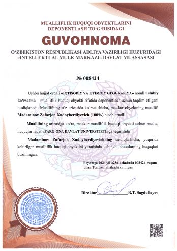 913 | №008424 | Uslubiy ko‘rsatma – "IQTISODIY VA IJTIMOIY GEOGRAFIYA" | Madaminov Zafarjon Xudoyberdiyevich (100%) | FARG‘ONA DAVLAT UNIVERSITETI | 12/25/2024 | ![]() |