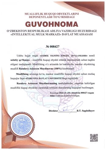 910 | №008427 | Uslubiy qo‘llanma – "O‘ZBEK TILINING SOHADA QO‘LLANILISHI" | Rasulova Azizaxon Muydinovna (100%) | FARG‘ONA DAVLAT UNIVERSITETI | 12/25/2024 | ![]() |