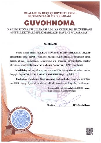 907 | №008430 | Lug‘at – "СЛОВАРЬ ТЕРМИНОВ И ВЫРАЗИТЕЛЬНЫХ СРЕДСТВ РИТОРИКИ" | Davlyatova Gulchexra Nasirovna (100%) | FARG‘ONA DAVLAT UNIVERSITETI | 12/25/2024 | ![]() |