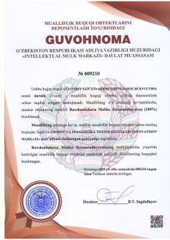 | 906 | №009206 | Вarslik (1-sinf) – «ВОСПИТАНИЕ» (TARBIYA) | Fominova Anastasiya Olegovna (50%), Latipova Lutfiye Ayderovna (50%) | «AXBOROT VA PEDAGOGIKA TEXNOLOGIYALARI INNOVATSION MARKAZI» mas’uliyati cheklangan jamiyati | 09/04/2025 | ![]() |