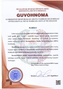 | 901 | №009211 | Grafik ilova (1-sinf) – «TASVIRIY SAN’AT» (ИЗОБРАЗИТЕЛЬНОЕ ИСКУССТВО) | Ravshanbekova Malika Raxmatullayevna (100%) | «AXBOROT VA PEDAGOGIKA TEXNOLOGIYALARI INNOVATSION MARKAZI» mas’uliyati cheklangan jamiyati | 09/04/2025 | ![]() |
