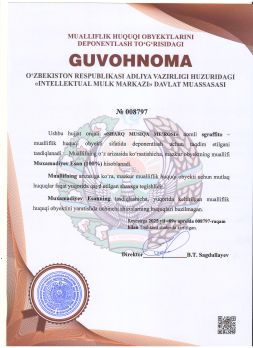 | 9282 | №0008797 | Sgraffito – "SHARQ MUSIQA ME’ROSI" | Muxamadiyev Esan (100%) | Muxamadiyev Esan | 04/09/2025 | ![]() |
