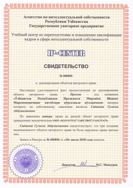 | 9306 | №000856 | Проект - "Ўзбекистон Республикаси Президенти Мирзиёев Шавкат Миромоновичнинг китоблари кўргазмали қўлланмаси" | Сидикова Гулноза Абдумаликовна | ООО "MANAVIYAT TARG’IBOT FAOLIYATI" | 07/10/2018 | ![]() |
