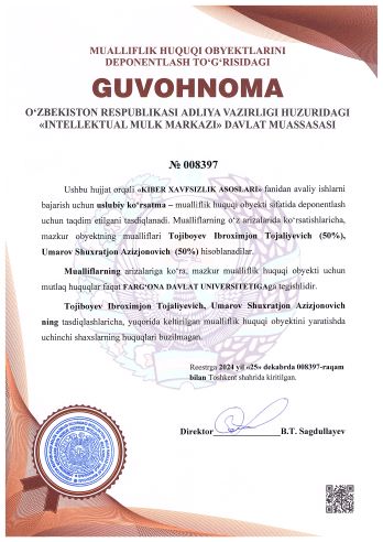 940 | №008397 | Uslubiy ko‘rsatma – "KIBER XAVFSIZLIK ASOSLARI" | Tojibayev ibroximjon Tojaliyevich (50%), Umarov Shuxratjon Azizjonovich (50%) | FARG‘ONA DAVLAT UNIVERSITETI | 12/25/2024 | ![]() |