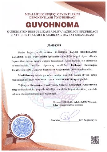 939 | №008398 | O’quv-uslubiy qo‘llanma– "LMSDA ELEKTRN TA’LIM RESURSLARINI YARATISH TEXNOLOGIYASI" | Tojiboyev Ibroximjon Tojaliyevich (50%), Umarov Shuxratjon Azizjonovich (50%) | FARG‘ONA DAVLAT UNIVERSITETI | 12/25/2024 | ![]() |
