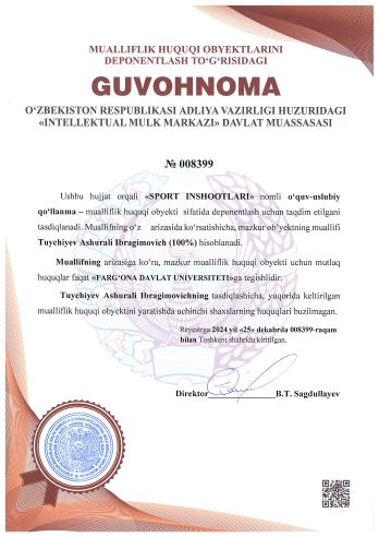 938 | №008399 | O‘quv-uslubiy qo‘llanma – "SPORT INSHOOTLARI" | Tuychiyev Ashurali Ibragimovich (100%) | FARG‘ONA DAVLAT UNIVERSITETI | 12/25/2024 | ![]() |