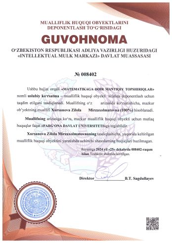 935 | №008402 | Uslubiy ko‘rsatma – "MATEMATIKAGA DOIR MANTIQIY TOPSHIRIQLAR MATEMATIKAGA DOIR MANTIQIY TOPSHIRIQLAR " | Xursanova Zilola Mirzaxolmatovna (100%) | FARG‘ONA DAVLAT UNIVERSITETI | 12/25/2024 | ![]() |