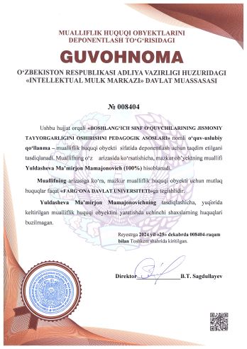 933 | №008404 | O’quv-uslubiy qo‘llanma– "BOSHLANG‘ICH SINF O‘QUVCHILARINING JISMONIY TAYYORGARLIGINI OSHIRISHNI PEDAGOGIK ASOSLARI" | Yuldasheva Ma’mirjon Mamajonovich (100%) | FARG‘ONA DAVLAT UNIVERSITETI | 12/25/2024 | ![]() |