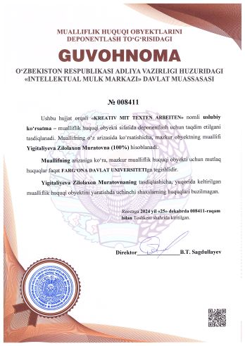 926 | №008411 | Uslubiy ko‘rsatma – "KREATIV MIT TEXTEN ARBEITEN" | Yigitaliyeva Zilolaxon Muratovna (100%) | FARG‘ONA DAVLAT UNIVERSITETI | 12/25/2024 | ![]() |