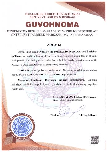 924 | №008413 | Uslubiy qo‘llanma – "XORIJIY TIL DARSLARIDA O‘YINLAR" | Xasanova Ozodaxon Qurvonali qizi (100%) | FARG‘ONA DAVLAT UNIVERSITETI | 12/25/2024 | ![]() |