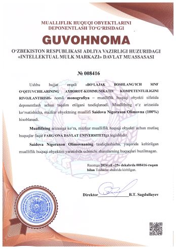 921 | №008416 | Monografiya –"BO‘LAJAK BOSHLANG‘ICH SINF O‘QITUVCHILARINING AXBOROT-KOMMUNIKATIV KOMPЕTЕNTLILIGINI RIVOJLANTIRISH" | Saidova Nigoraxon Olimovna (100%) | FARG‘ONA DAVLAT UNIVERSITETI | 12/25/2024 | ![]() |