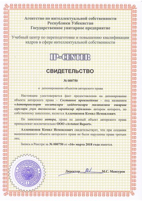 | 9414 | №000748 | Составное произведение -"Автотранспорт воситалари ҳайдовчилари малакасини ошириш курслари учун тақдимотлар тўплами " | Алламжонов Комил Исмоилович | OOO "Avtotest Report" | 03/16/2018 | ![]() |