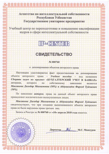 | 9402 | №000760 | Учебное пособие-"Сборник задач по предмет " БУХГАЛТЕРСКИЙ УЧЕТ В БАНКАХ" " | Мавлянова Дилобар Махкамовна(50%), Абдувахидов Фарход Туйчиевич (50%) | Мавлянова Дилобар Махкамовна и Абдувахидов Фарход Туйчиевич | 04/10/2018 | ![]() |