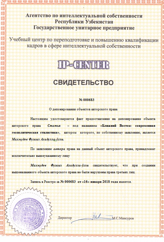| 9479 | №000683 | Статья – под названием «Ближний Восток: современная геополитическая стилистика» | Махмудов Фузаил Ахадулла-ўғли | Махмудов Фузаил Ахадулла-ўғли | 01/16/2018 | ![]() |