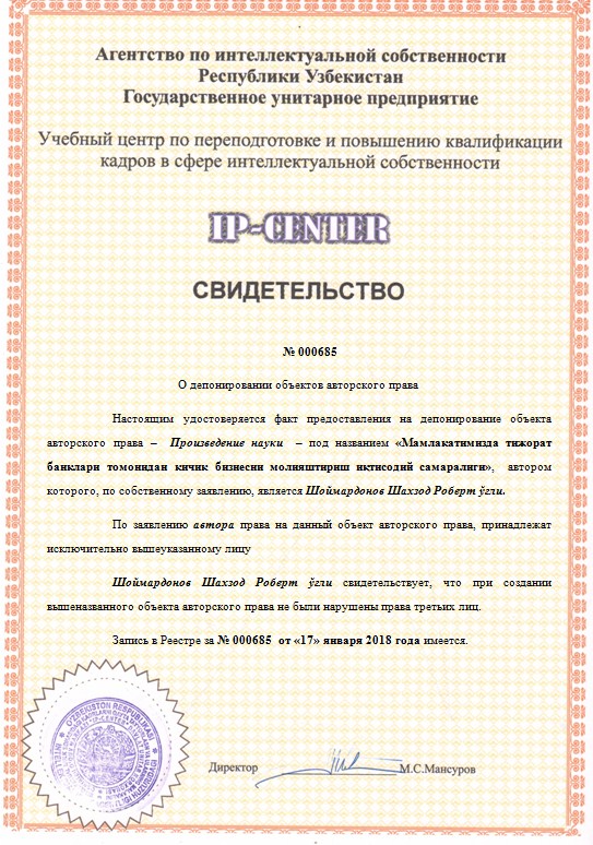 | 9477 | №000685 | Произведение науки – под названием «Мамлакатимизда тижорат банклари томонидан кичик бизнесни молияштириш иқтисодий самаралиги» | Шоймардонов Шахзод Роберт ўғли | Шоймардонов Шахзод Роберт ўғли | 01/17/2018 | ![]() |