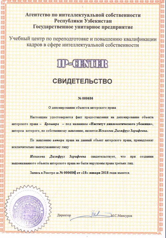 | 9476 | №000686 | Брошюра – под названием «Институт дипломатического убежища» | Исхакова Диляфруз Зарифовна | Исхакова Диляфруз Зарифовна | 01/18/2018 | ![]() |