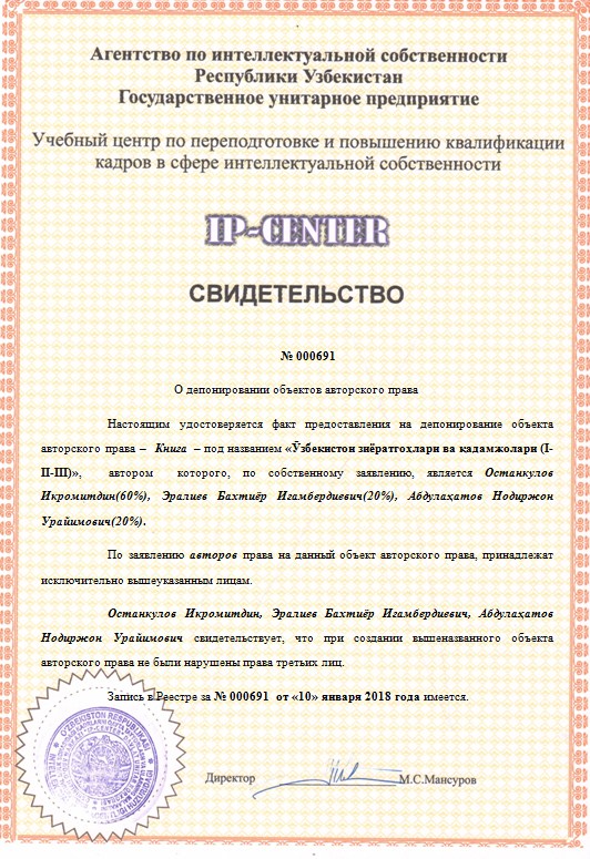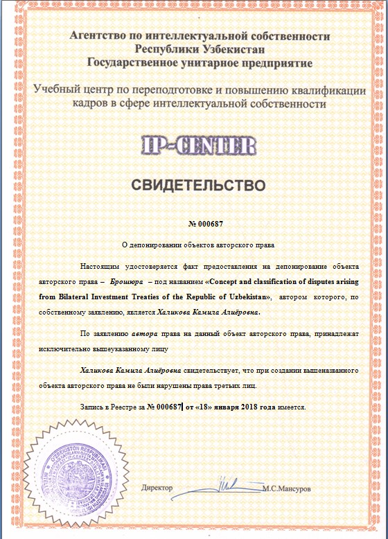 | 9475 | №000687 | Брошюра – под названием «Concept and classification of disputes arising from Bilateral Investment Treaties of the Republic of Uzbekistan», | Халикова Камила Алиёровна | Халикова Камила Алиёровна | 01/18/2018 | ![]() |