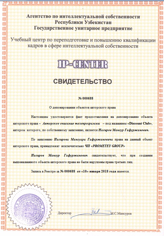 | 9474 | №000688 | Авторское описание телепрограммы – под названием «Discount Club», | Насиров Мансур Гафуржанович. | ЧП «PROMETEY GROUP» | 01/10/2018 | ![]() |