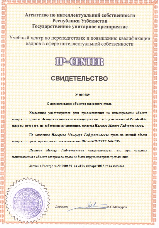 | 9473 | №000689 | Авторское описание телепрограммы – под названием «O’zimizniki», | Насиров Мансур Гафуржанович. | ЧП «PROMETEY GROUP» | 01/10/2018 | ![]() |