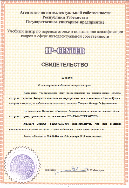 | 9472 | №000690 | Авторское описание телепрограммы -"Narxini Qara" | Насиров Мансур Гафуржанович | ЧП "PROMETEY IT GROUP" | 01/10/2018 | ![]() |
