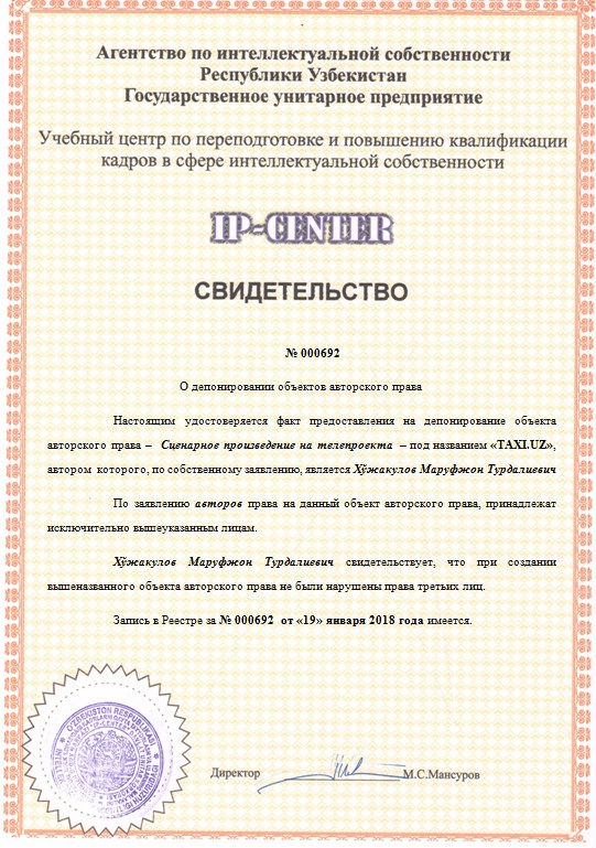 | 9470 | №000692 | Сценарное произведение на телепроекта-"TAXI.UZ" | Хўжакулов Маруфжон Турдалиевич | Хўжакулов Маруфжон Турдалиевич | 01/19/2018 | ![]() |