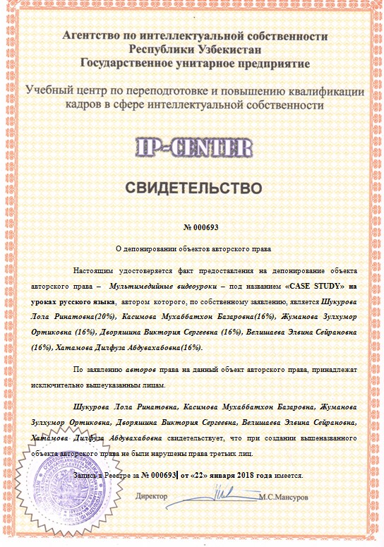 | 9469 | №000693 | Мультимедийные видеоуроки -"CASE STUDY" на уроках русского языка | Шукурова Лола Ринатовна(20%), Касимова Мухаббатхон Базаровна(16%), Жуманова Зулхумор Ортиковна (16%), Дворяшина Виктория Сергеевна (16%), Велишаева Элвина Сейрановна (16%), Хатамова Дилфуза Абдувахабовна(16%) | Шукурова Лола Ринатовна, Касимова Мухаббатхон Базаровна, Жуманова Зулхумор Ортиковна, Дворяшина Виктория Сергеевна, Велишаева Элвина Сейрановна, Хатамова Дилфуза Абдувахабовна | 01/22/2018 | ![]() |