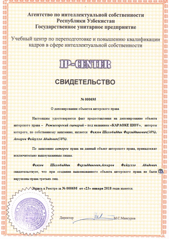 | 9467 | №000695 | Режиссерский сценарий-"КАРАОКЕ ШОУ" | Фаязов Шахобиддин Фарзиддинович(50%), Аскаров Файзулло Абидович(50%) | Фаязов Шахобиддин Фарзиддинович,Аскаров Файзулло Абидович | 23.01.2018 | ![]() |