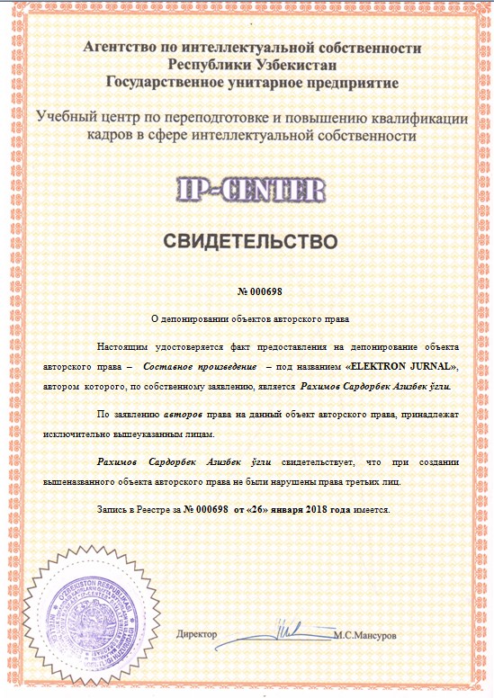 | 9464 | №000698 | Составное произведение -"ELEKTRON JURNAL" | Рахимов Сардорбек Азизбек ўғли | Рахимов Сардорбек Азизбек ўғли | 26.01.2018 | ![]() |