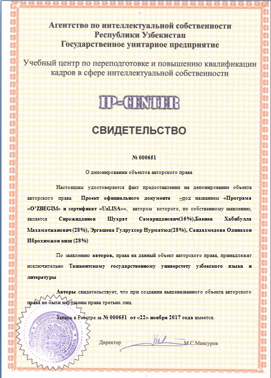 | 9511 | №000651 | Проект официального документа –под названием «Програма «O’ZBEGIM» и сертификат «UzLISA»», | Сирожиддинов Шухрат Самариддиович(16%),Бакиев Хабибулла Махаматжанович (28%), Эргашева Гулрухсор Нурматзод(28%), Саидахмедова Одинахон Иброхимжон кизи (28%) | Сирожиддинов Шухрат Самариддиович,Бакиев Хабибулла Махаматжанович ), Эргашева Гулрухсор Нурматзод, Саидахмедова Одинахон Иброхимжон кизи | 11/22/17 | ![]() |