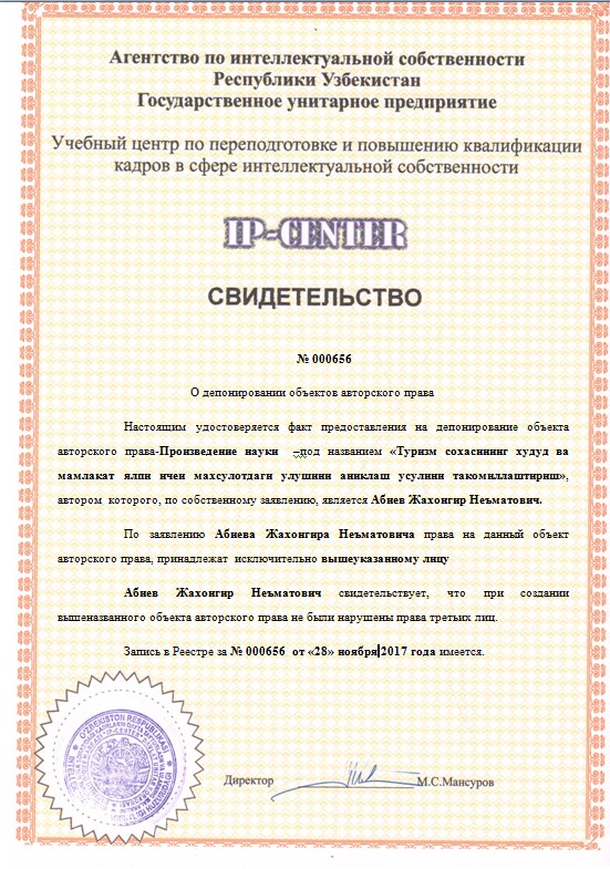 | 9506 | №000656 | Произведение науки –под названием «Туризм сохасининг худуд ва мамлакат ялпи ичеи махсулотдаги улушини аниклаш усулини такомиллаштириш» | Абиев Жахонгир Неъматович | Абиев Жахонгир Неъматович | 11/28/2016 | ![]() |