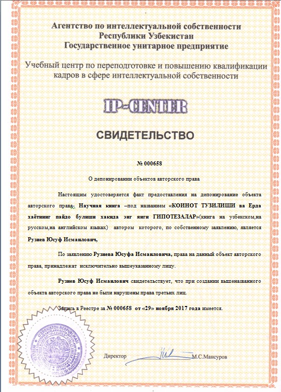 | 9504 | №000658 | Научная книга –под названием «КОИНОТ ТУЗИЛИШИ ва Ерда хаётнинг пайдо булиши хакида энг янги ГИПОТЕЗАЛАР» | Рузиев Юсуф Исмаилович | Рузиев Юсуф Исмаилович | 11/29/2017 | ![]() |