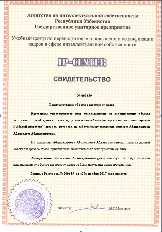 | 9503 | №000659 | Научная статья –под названием «Атмосферадан энергия олиш сирлари » | Абдирахимов Абдисалом Абдикаримович | Абдирахимов Абдисалом Абдикаримович. | 11/29/2016 | ![]() |