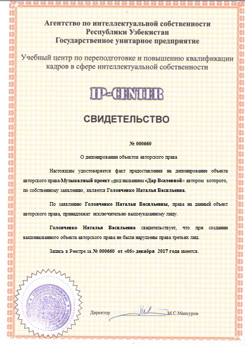 | 9502 | №000660 | Музыкалный проект –под названием «Дар Вселенной» | Головченко Наталья Васильевна | Головченко Наталья Васильевна | 12/05/2017 | ![]() |