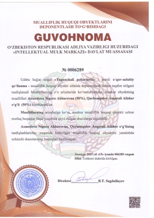 | 9539 | №000624 | Учебное пособие - под названием «Молиявий ҳисоб» | Тулаев Мирзакул Саламович | Тулаев Мирзакул Саламович | 06.11.2017 | ![]() |