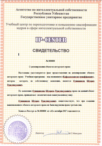 | 9563 | №000600 | Учебная программа- «Кафолатланган муваффақият» | Суюндиков Шухрат Турсункулович | Суюндиков Шухрат Турсункулович | 12.10.2017 | ![]() |