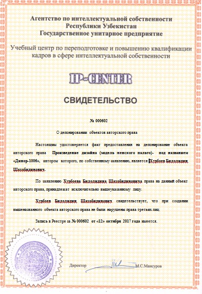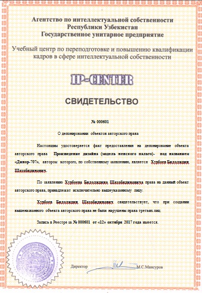 | 9562 | №000601 | Произведение дизайна (модель женского пальто)- «Динор-707» | Хурбоев Билолидин Шахобидинович | Хурбоев Билолидин Шахобидинович | 12.10.2017 | ![]() |