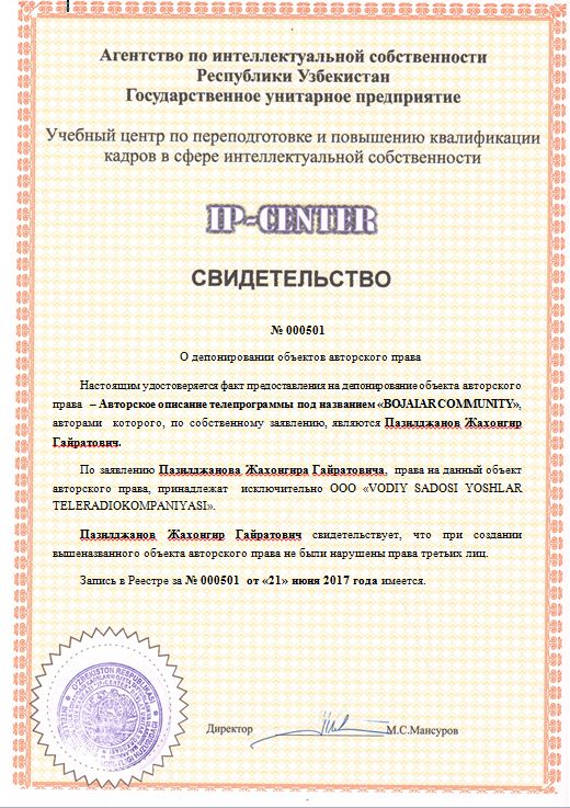 | 9662 | №000501 | Авторское описание телепрограммы под названием «BOJAIAR COMMUNITY», | Пазилджанов Жахонгир Гайратович. | OOO «VODIY SADOSI YOSHLAR TELERADIOKOMPANIYASI». | 21.06.2017 | ![]() |