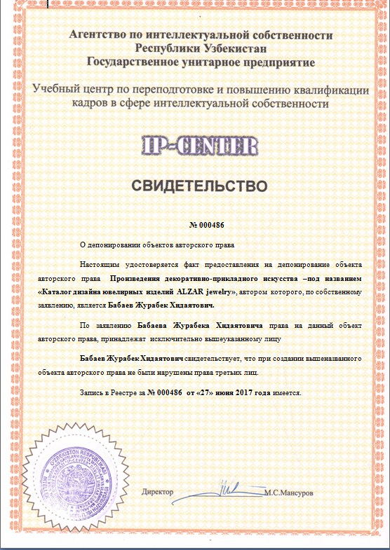 | 9677 | №000486 | Произведения декоративно-прикладного искусства –под названием «Каталог дизайна ювелирных изделий ALZAR jewelry» | Бабаев Журабек Хидаятович | Бабаев Журабек Хидаятович | 06/27/2017 | ![]() |