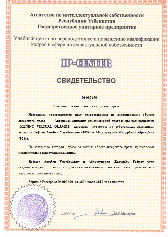 | 9673 | №000490 | Авторское описание компьютерной программы под названием «MENING VIRTUAL OLAMIM» | Вафоев Азизбек Улуғбекович (40%) и Абдушукуров Жасурбек Ғайрат ўғли (50%) | Вафоев Азизбек Улуғбекович и Абдушукуров Жасурбек Ғайрат ўғли | 07/07/2017 | ![]() |