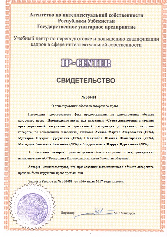 | 9672 | №000491 | Произведение науки под названием «Схема диагностики и лечения преждевременной эякуляции и эректильной дисфункции у мужчин» | Акилов Фархад Атауллаевич (10%), Мухтаров Шухрат Турсунович (10%), Шавахабов Шавкат Шанасирович (20%), Махмудов Аъзамжон Талатович (30%) и Абдурахманов Фаррух Фуркатович (30%) | АО “Республика Ихтисослаштирилган Урология Маркази” | 07/06/2017 | ![]() |
