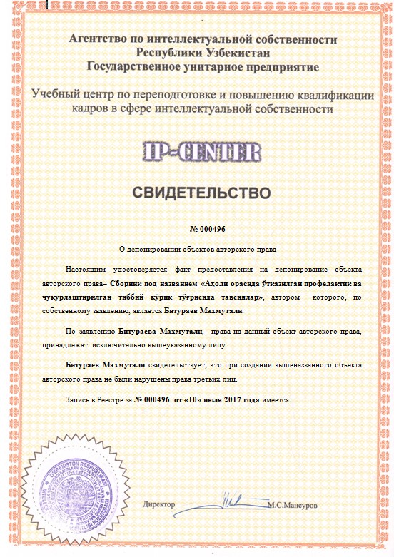 | 9667 | №000496 | Сборник под названием «Аҳоли орасида ўтказилган профелактик ва чуқурлаштирилган тиббий кўрик тўғрисида тавсиялар» | Битураев Махмутали | Битураев Махмутали | 07/10/2017 | ![]() |