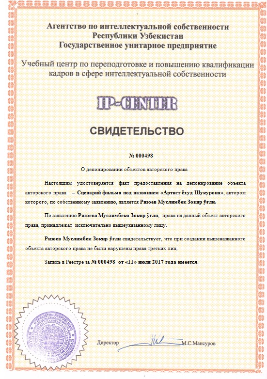 | 9665 | №000498 | Сценарий фильма под названием «Артист ёхуд Шукурона» | Ризоев Муслимбек Зокир ўғли | Ризоев Муслимбек Зокир ўғли | 07/11/2017 | ![]() |