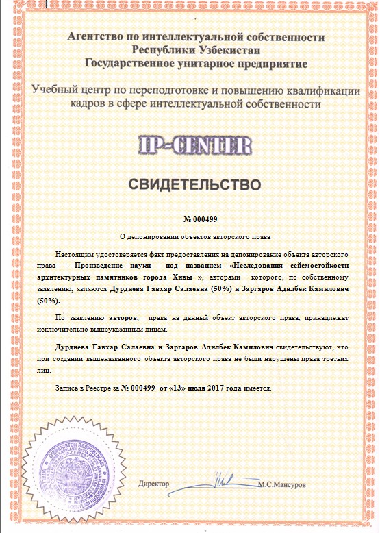 | 9664 | №000499 | Произведение науки под названием «Исследования сейсмостойкости архитектурных памятников города Хивы » | Дурдиева Гавхар Салаевна (50%) и Заргаров Адилбек Камилович (50%) | Дурдиева Гавхар Салаевна и Заргаров Адилбек Камилович | 07/13/2017 | ![]() |