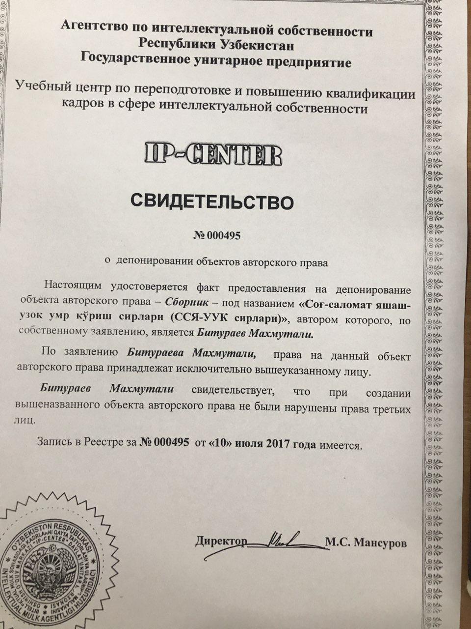 | 9668 | №000495 | Сборник "Соғ-саломат яшаш-узоқ умр кўриш сирлари (ССЯ-УУК сирлари) | Битураев Махмутали | Битураев Махмутали | 10.07.2017 | ![]() |