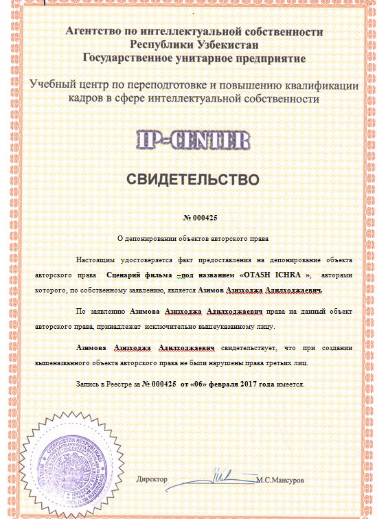 | 9738 | №000425 | Сценарий фильма –«OTASH ICHRA » | Азимов Азизходжа Адилходжаевич | Азимов Азизходжа Адилходжаевич | 02/06/2017 | ![]() |