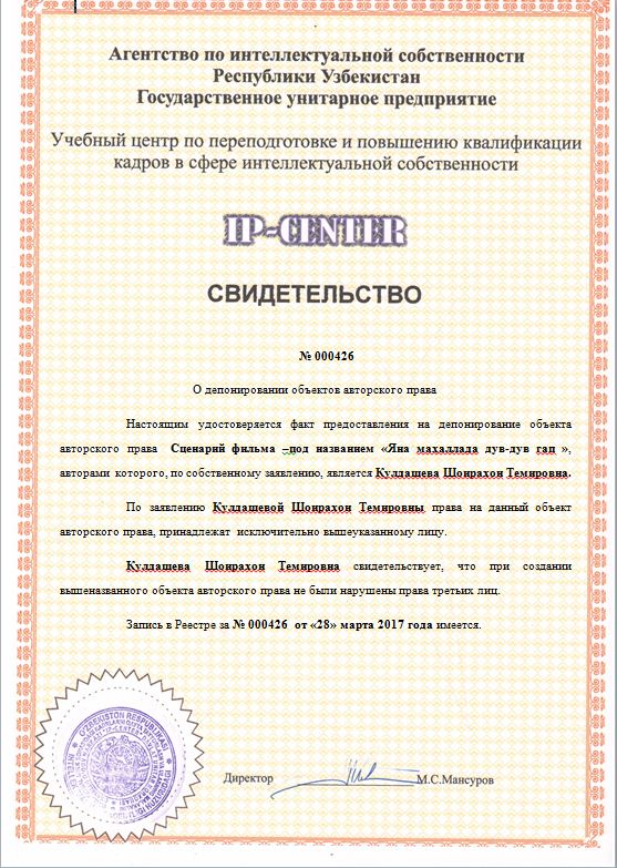 | 9737 | №000426 | Сценарий фильма –«Яна маҳаллада дув-дув гап » | Кулдашева Шоирахон Темировна | Кулдашева Шоирахон Темировна | 03/28/2017 | ![]() |
