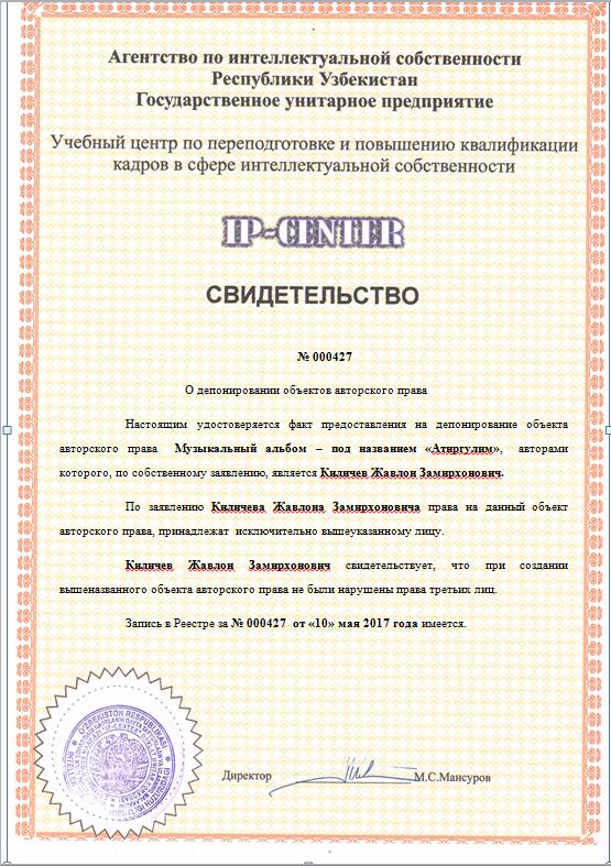 | 9736 | №000427 | Музыкальный альбом –«Атиргулим » | Киличев Жавлон Замирхонович | Киличев Жавлон Замирхонович | 05/10/2017 | ![]() |
