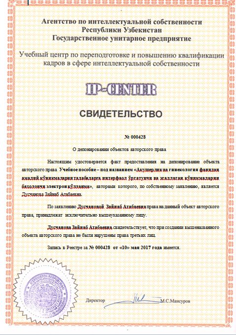 | 9735 | №000428 | Учебное пособие – «Акушерлик ва гинекология фанидан амалий кўникмаларни талабаларга интерфаол ўргатувчи ва эгаллаган кўникмаларни баҳоловчи электрон қўлланма » | Дусчанова Зайнаб Атабаевна | Дусчанова Зайнаб Атабаевна | 05/10/2017 | ![]() |